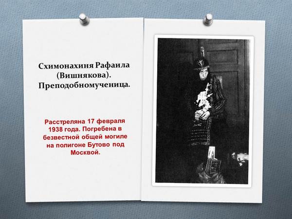Следствие по 58-й статье Уголовного кодекса, по которой проходили все так называемые «политические осужденные», практически никогда не было выяснением истины. Истина была не нужна. Схимонахиню Рафаилу (Вишнякову) при аресте сотрудники НКВД сфотографировали в схимническом облачении, которое они сочли достаточной уликой ее «преступной деятельности». Следователь не стал допытываться, признает ли она себя виновной. 17 февраля 1938 года она была расстреляна[3].
