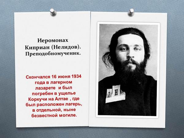 Отец Киприан (Нелидов) был отправлен в лагерь на Алтае, на строительство Бийского тракта. Находившаяся в том же лагере православная мирянка из Москвы вспоминала о нем: «Чудная, светлая личность был этот отец Киприан. Всегда ровный, светлый, ясный, на вид русский витязь, полный сил и здоровья <…> В лагере вместо бараков стояли палатки с двухэтажными нарами, которые обогревались железными печурками. Здесь отцу Киприану многое пришлось претерпеть – «его окружали грубость, распущенность и развращенность. Но он все побеждал своей кротостью. Будучи дневальным в палатке этих разнузданных людей, он им не перечил, не укорял, старался услужить... любил их, и когда вскоре умер... то один из них вспоминал о нем со слезами»[11]. Смерть отца Киприана произвела большое впечатление на заключенных, даже на уголовников, увидевших в нем образец истинного ученика Христова.