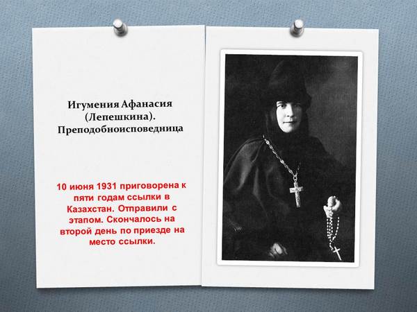 Через несколько дней после ареста состояние игумении Афанасии, бывшей настоятельницы Троице-Одигитриевской Зосимовой пустыни резко ухудшилось, и ее отправили в больницу, откуда она писала: «Лежу в заразном бараке. Чувствую себя плохою. Все болит, а особенно левый бок. Температура повышена. Сердце мое истерзалось. Осталась я одна. Дуню, наверное, пока я в больнице, угонят, как угнали уж многих. <…> Неизвестность хуже всего. Буду ждать от Вас какого-нибудь слова. Не забывайте меня, находящуюся в большом горе»[5].