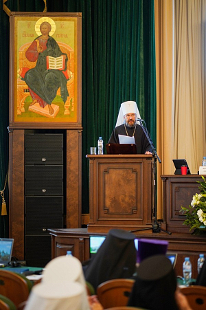 С докладом о подготовке Синодальной библейско-богословской комиссией документа «Об искажении православного учения о Церкви в деяниях Константинопольского Патриархата и выступлениях его представителей» выступил председатель Комиссии митрополит Венгерский и Будапештский Иларион.