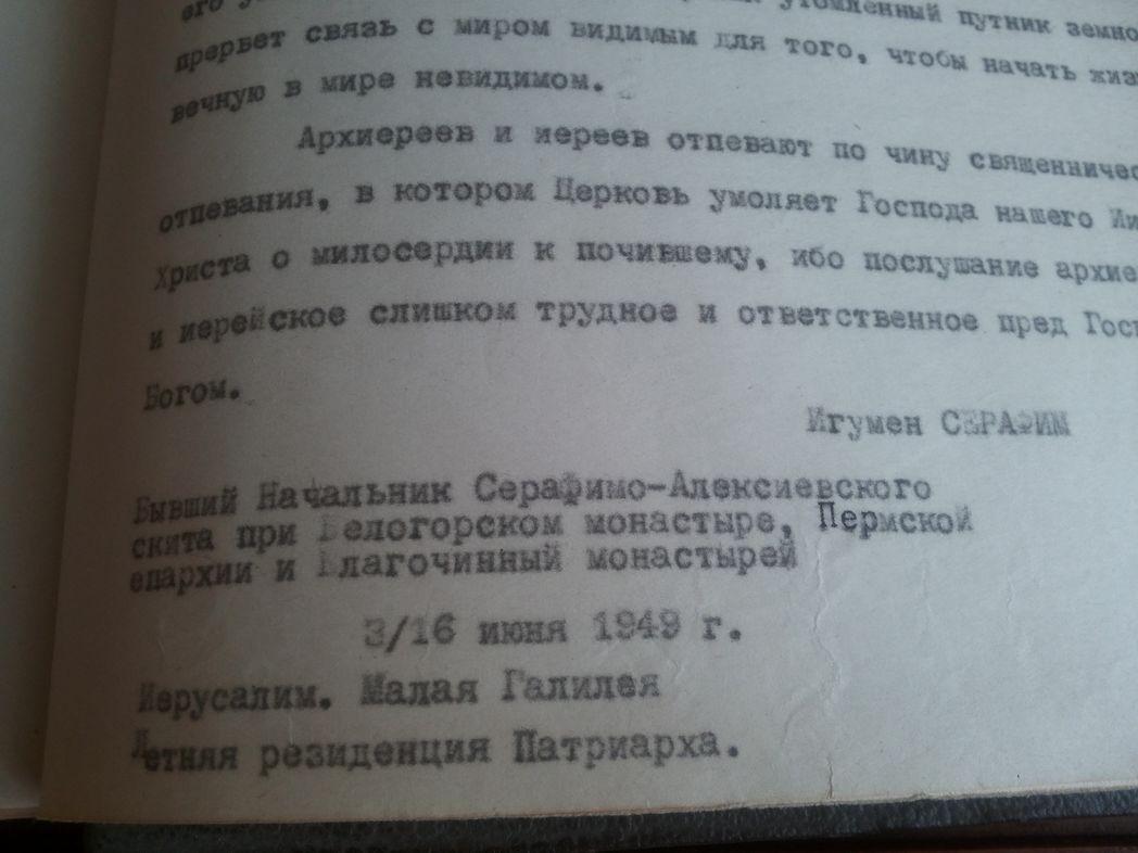 [25] Серафим (Кузнецов), игум. «Бывший Начальник Серафимо-Алексеевского скита при Белогорском монастыре Пермской епархии и Благочинный монастырей. “Монастырский мужской общежительный устав”. 3/16 июня 1949. Иерусалим. Малая Галилея. Летняя резиденция Патриарха». (252 стр., машинопись).