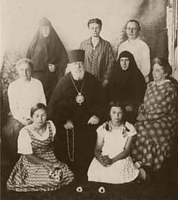 Митрополит Серафим в Воскресенском Феодоровском монастыре под Шуей. Лето 1928 г. Рядом с Владыкой – настоятельница монастыря игумения Арсения. Стоят (слева направо): дочери Наталия (монахиня Серафима) и Леонида, мать Варвары Васильевны (впоследствии монахиня Серафима). У ног Владыки: внучки Леонида и Варвара (впоследствии игумения Серафима)