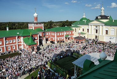 У святых врат монастыря Святейшего Патриарха встречали митрополит Крутицкий и Коломенский Ювеналий, председатель Московской областной думы И.Ю. Брынцалов, глава Дмитровского муниципального района Московской области В.В. Гаврилов, наместник монастыря игумен Григорий (Клименко).