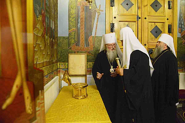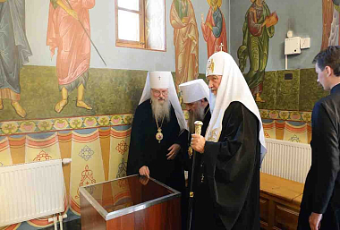 В храме Первосвятитель приветствовал игумена Кирилла и насельников обители. В благословение на труды Святейший Владыка передал игумену Кириллу наперсный крест, изготовленный к Поместному Собору 2009 года, на котором Предстоятелем Русской Православной Церкви был избран Патриарх Кирилл. В дар храму Святейший Патриарх передал икону святого благоверного князя Игоря Черниговского.