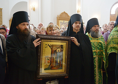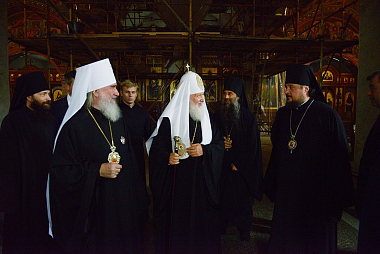 В дар монастырю Святейший Патриарх передал икону Христа Спасителя. Архимандриту Тихону Предстоятель вручил наперсный крест.