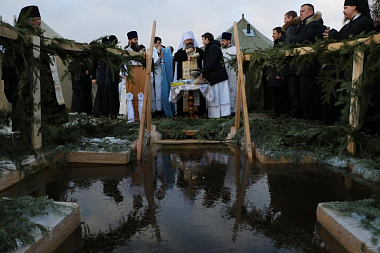 Затем почетные гости Верхотурья направились в скит Актай – подворье Свято-Николаевского мужского монастыря. Здесь губернатор и митрополит Кирилл посетили пункт временного размещения беженцев с Украины, после чего на реке Актай была освящена Крещенская иордань.