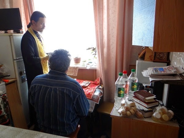 К сожалению, не все желающие имеют возможность прийти на богослужение. Клирик Введенской обители иеромонах Тихон (Просыпкин) и инокиня Фотиния (Соловьева), сотрудница социального отдела обители, в этот день приехали к своим подопечным Сергею Полянскому, члену общества инвалидов-опорников «Надежда», и инвалиду Олегу, чтобы совершить Таинства Исповеди и Причастия.