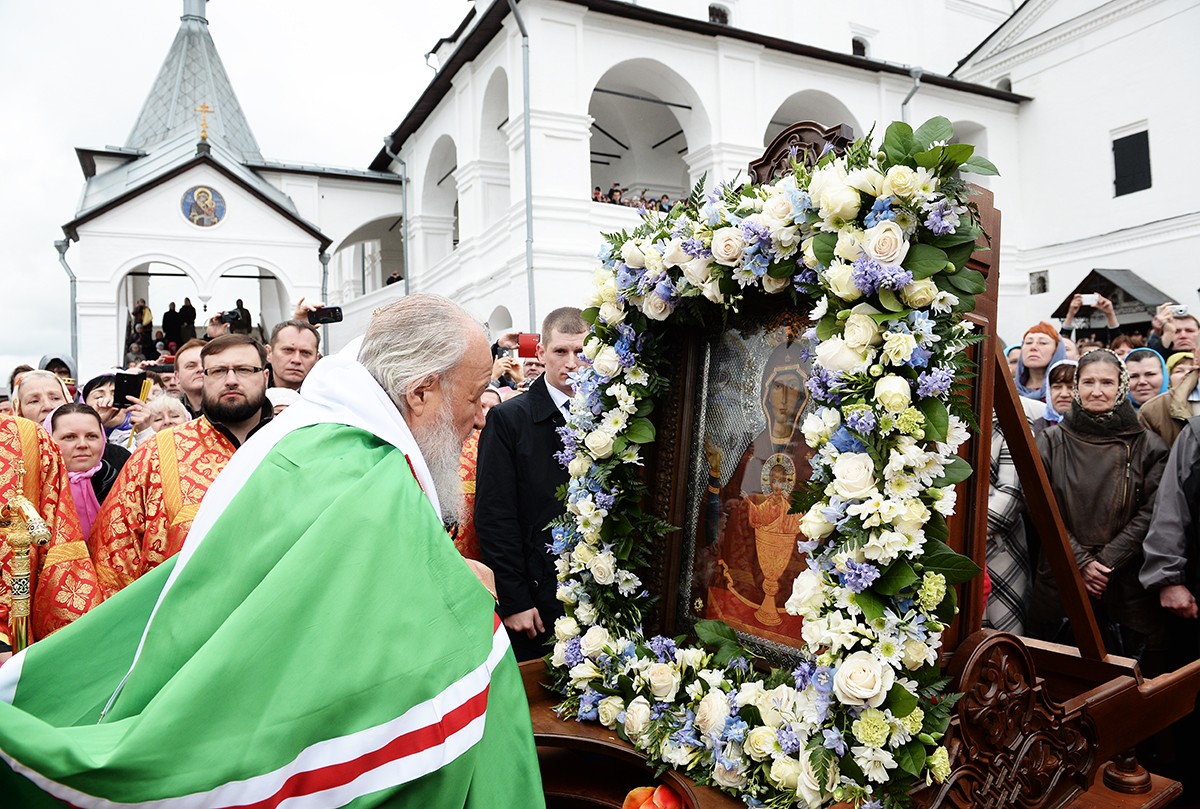 На монастырской площади, где под сенью между Никольским собором и настоятельским корпусом с церковью в честь Иконы Божией Матери «Скоропослушница» был установлен Престол, Предстоятель Русской Церкви совершил Божественную литургию.