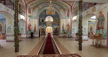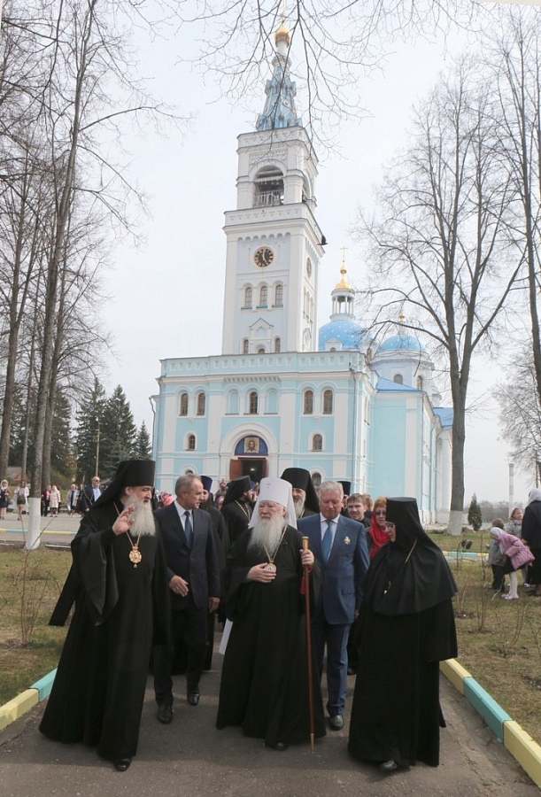 В этот великий, ликующий праздник Пасхи Ваше Высокопреосвященство освятило сегодня наш собор Спаса Нерукотворного Спасо-Влахернского женского монастыря. История этого монастыря такова, что основание его очень древнее. Предки императорского рода имели очень огромное имение в этом монастыре. Они основали эту обитель, в монастыре было очень много икон которые были украшены драгоценными камнями, золотом и серебром. Монастырь в это время процветал, славился и ликовал, но пришли времена, когда он, к сожалению, был закрыт и пережил очень тяжелые времена: разграбление и в последствие закрытие. В 2001 году, наконец то, мы вновь обрели право, чтобы наш монастырь снова ожил, и началось его глубокое возрождение. И уже новый род наших других благодетелей, род Тягачевых, начал новый этап восстановления этой обители и возрождение этого собора. Разрешите в этот праздничный день поздравить Вас, Ваше Высокопреосвященство, и пожелать Вам доброго здравия в это Воскресение. Христос Воскресе!»