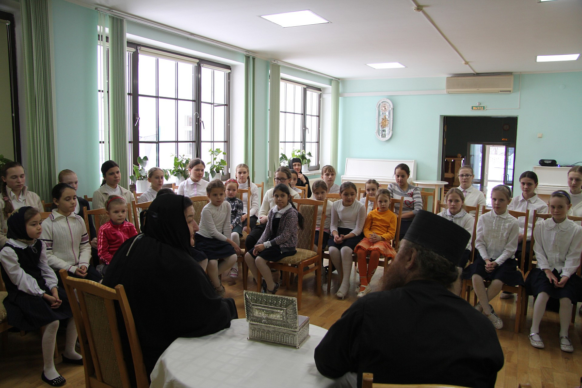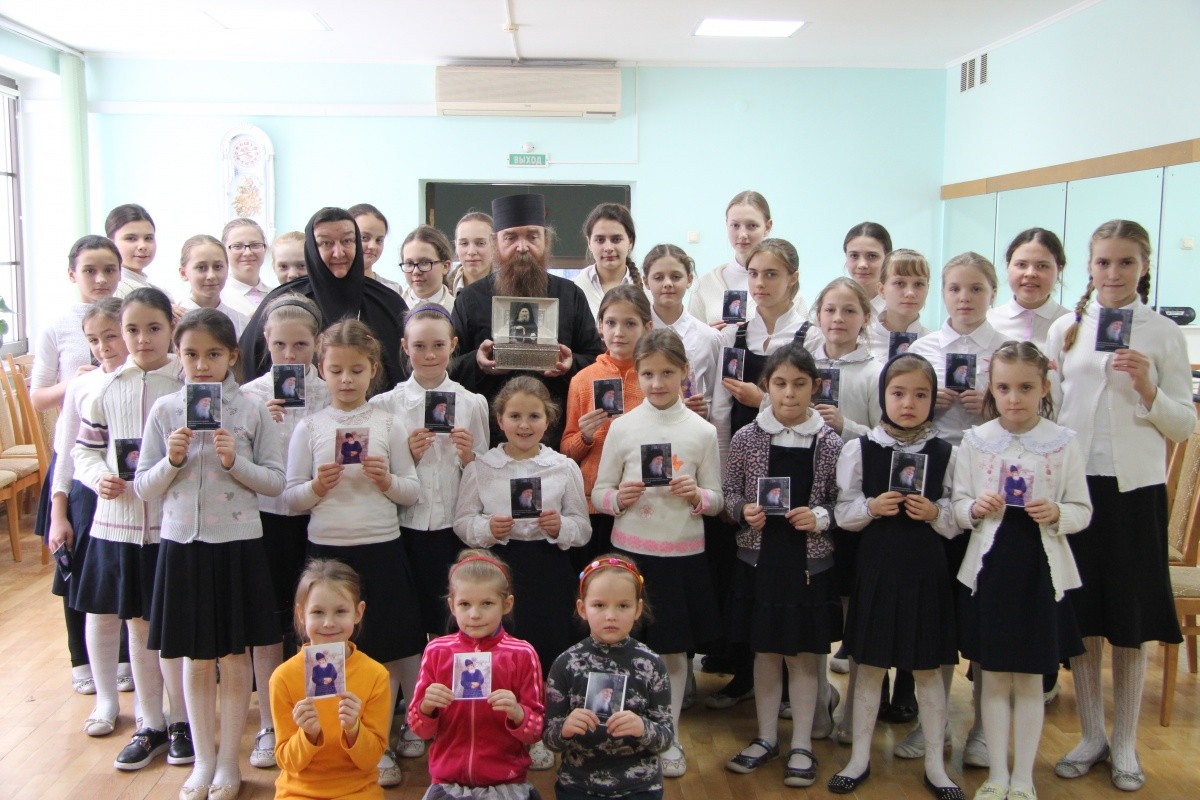 После монашеской встречи отец Никодим посетил воспитанниц пансиона «Отрада». Девочки показали геронде свои келии и классы в приюте и исполнили для гостя песнопения на греческом языке: «Аксион Эсти» («Достойно есть») и тропарь Афонским отцам. Старец дал детям наставление, как важно быть с Богом, хранить веру и не терять живую связь с Церковью. Воспитанницы приюта попросили старца помолиться, чтобы Бог помог им хорошо учиться и сдать экзамены на отлично.