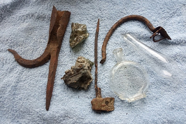 Среди предметов – фрагменты оплавившихся стеклянных сосудов, бутылочка для хранения елея, хозяйственная утварь, инструмент для ремонта медной и оловянной посуды.