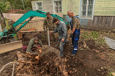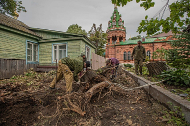 Силами братии были произведены распил и уборка корней, стволов и ветвей поваленных и поврежденных ветром деревьев, а также уборка территории Марфо-Мариинской обители.