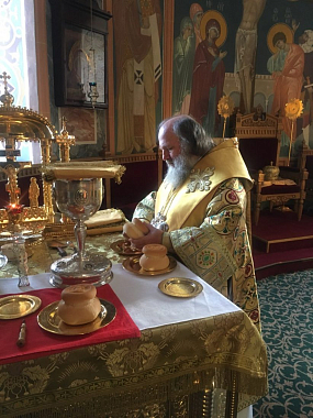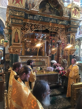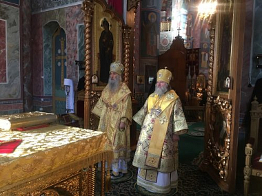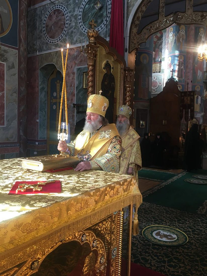 Его Высокопреосвященству сослужили: митрополит Ханты-Мансийский и Сургутский Павел; иерей Сергий Нагорный, ключарь Воскресенского кафедрального собора г. Ханты-Мансийска; духовенство, совершающее паломничество в обитель.