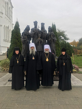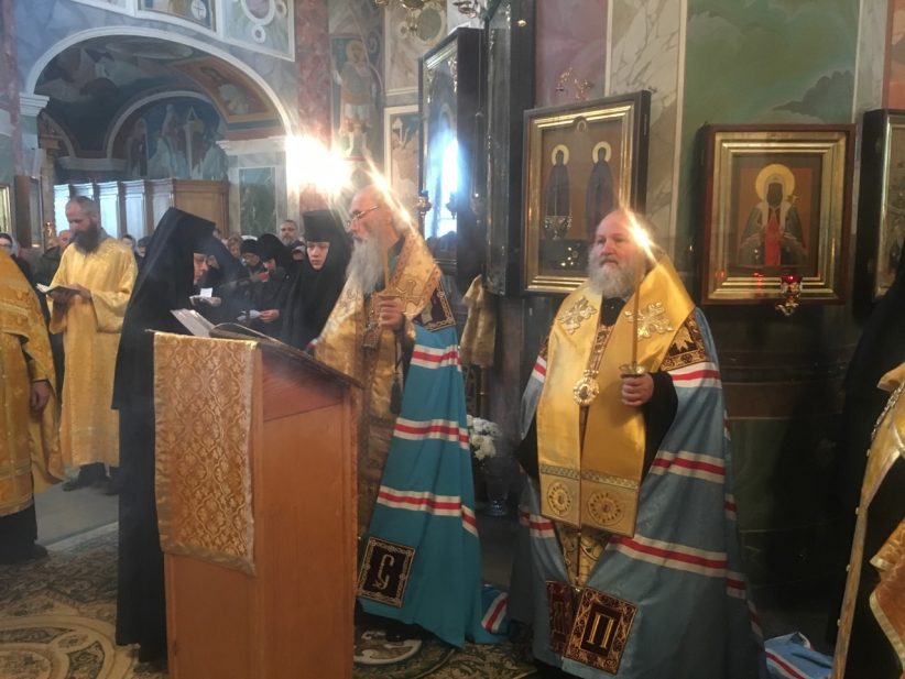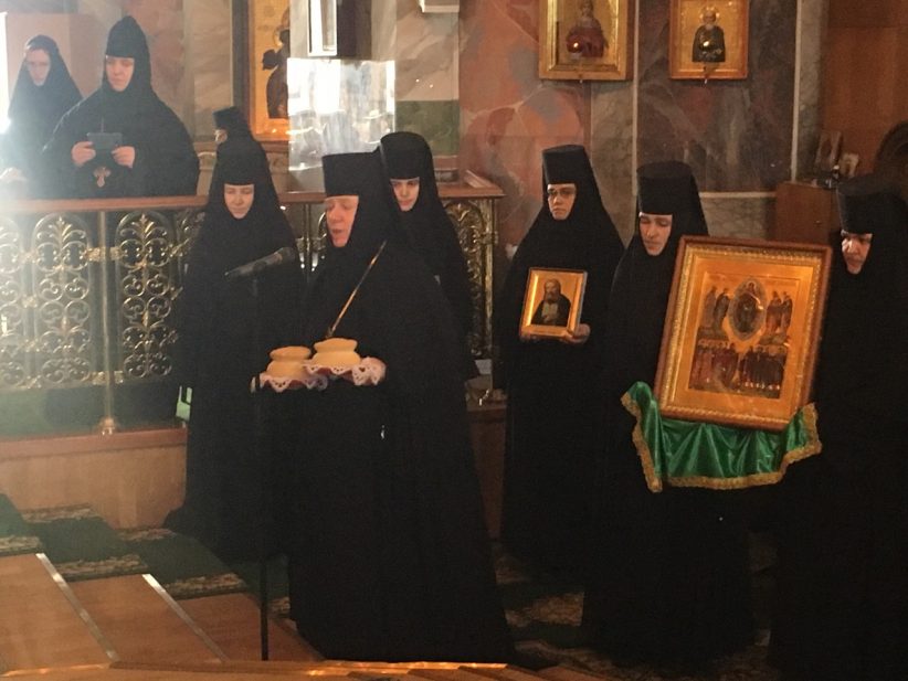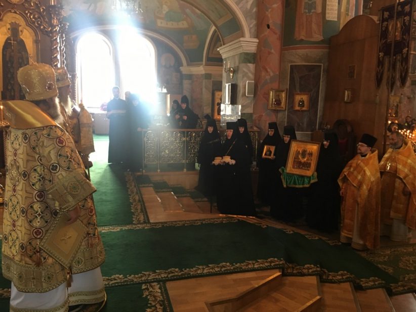 По окончании богослужения игумения Сергия приветствовала Высокопросвященных владык в святой обители и в знак благодарности на молитвенную память преподнесла иконы преподобного Серафима Саровского.