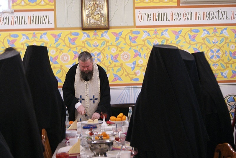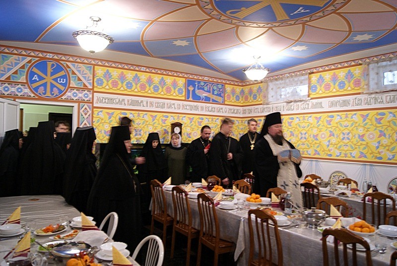 Затем участники богослужения были приглашены на трапезу. Владыка Дионисий совершил чин о панагии, сестры исполнили песнопения. Во время трапезы монахиня прочла сказание о Введении во храм Пресвятой Богородицы, а затем о чудесных случаях из житий монахов древности из книги «Благолюбие».