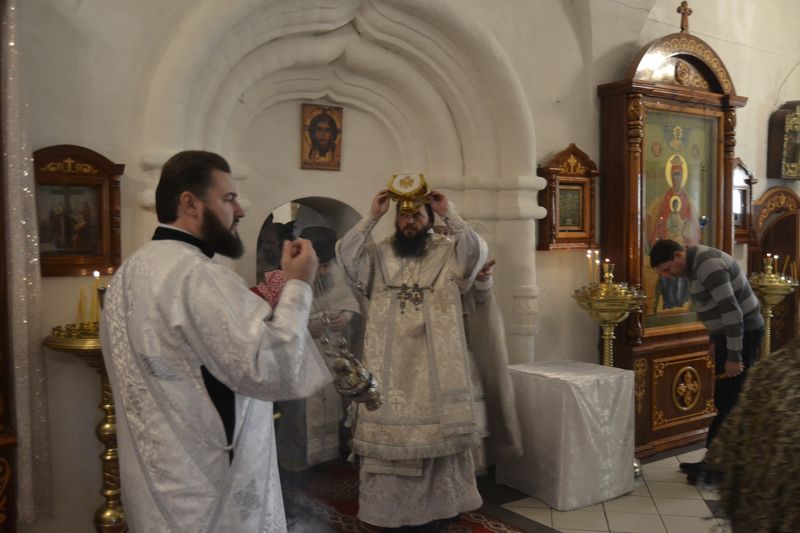 При открытых Царских вратах епископ Феодор коленопреклоненно вместе со всеми верующими просил Господа нашего Иисуса Христа ниспослать Пресвятого Духа и освятить храм и жертвенник сей. По окончании священнодействий престол облачили в двойные покрывала: нижнее белое, знаменующее собой погребальную плащаницу Спасителя, и верхнее украшенное, изображающее Его вечную Небесную славу.