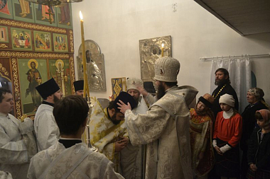 Во время богослужения на малом входе епископ Феодор наградил клирика Алексеевского женского монастыря иерея Артемия Омельянова правом ношения камилавки.