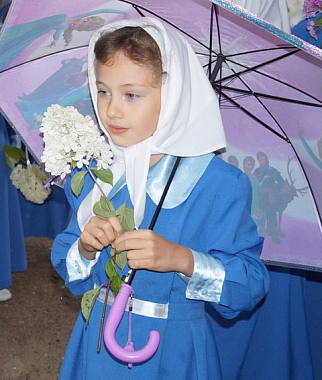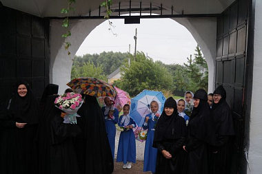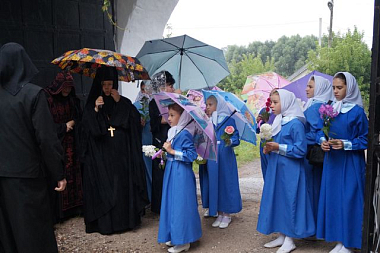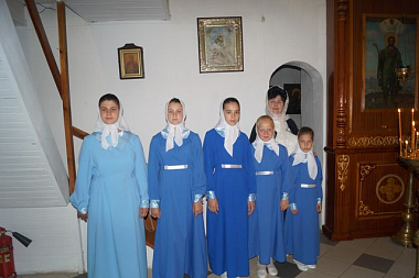 Владыку встречали воспитанницы детского приюта при Алексеевском монастыре вместе с директором приюта Н.А. Сельской, а также настоятельница обители игумения Магдалина (Сельская) и сестры обители.