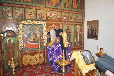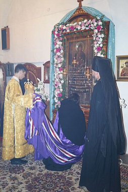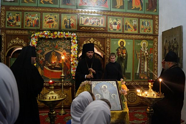 Епископ Феодор приложился к находящейся в обители чудотворной иконе Божией Матери «Вратарница» и благословил собравшихся в храме.