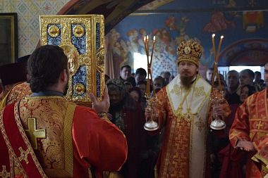 На малом входе епископ Феодорит по случаю престольного праздника монастыря удостоил насельника обители иеромонаха Евфимия (Данилова) правом ношения наперсного креста.