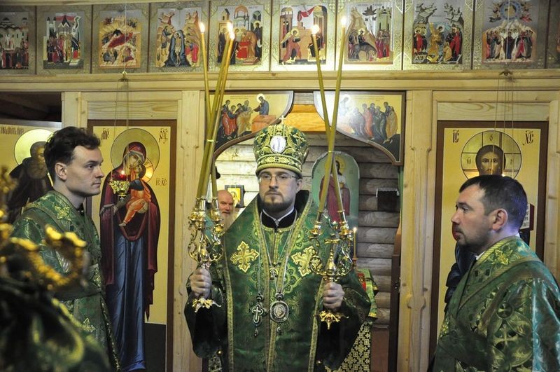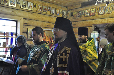 Правящему архиерею Череповецкой епархии сослужили благочинный Белозерского округа протоиерей Александр Стулов и иеромонах Феодосий (Белов).