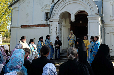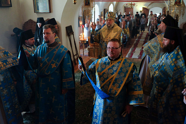 За праздничным богослужением Его Преосвященству сослужили: секретарь Александровской епархии иеромонах Даниил (Колесников), игумен Свято-Успенского Космо-Яхромского мужского монастыря Серафим (Котенев), игумен Богородице-Рождественской Лукиановой пустыни Тихон (Шибеко) и братия монастыря в священном сане.