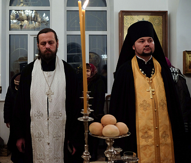 Его Преосвященству сослужили секретарь епархии иеромонах Даниил (Колесников), игумен Свято-Успенского Косьмо-Яхромского мужского монастыря Серафим (Котенев).