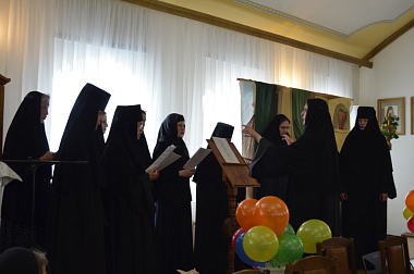 По окончании богослужения все паломники были приглашены на трапезу, во время которой матушку игумению поздравили сестры обители, исполнившие песнопения для всех гостей, и учащиеся Воскресной школы при монастыре, преподнесшие в подарок игумении Ольге спектакль, в основу сюжета которого было положено житие святой равноапостольной княгини Ольги.