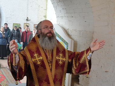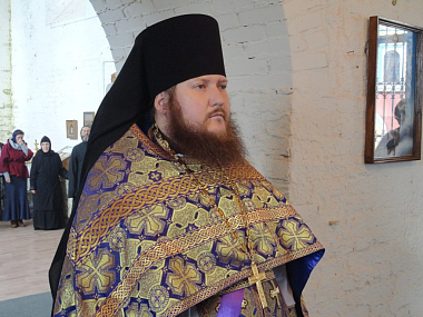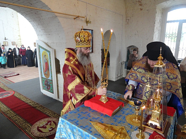 Его Преосвященству сослужили наместник монастыря иеромонах Арсений (Девятериков) и братия монастыря в священном сане.