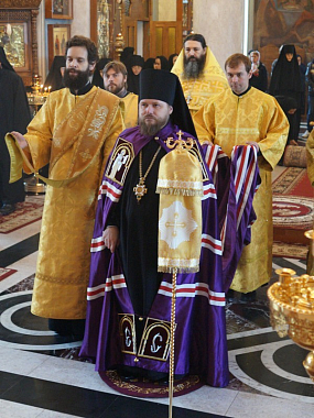 Преосвященному архиерею сослужили клирики обители.