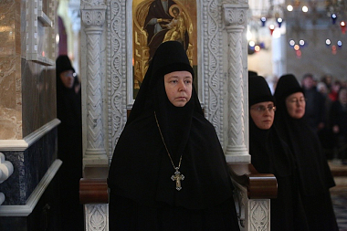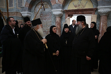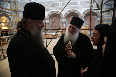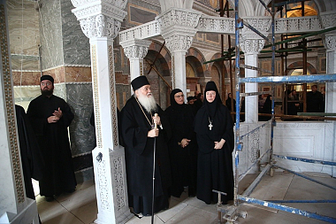 По завершении богослужения владыка Кирилл и архимандрит Ефрем в сопровождении настоятельницы обители игумении Домники (Коробейниковой) осмотрели восстанавливаемые храмы Александро-Невского Ново-Тихвинского монастыря.