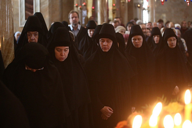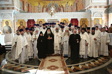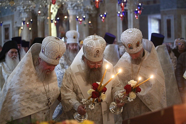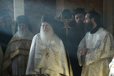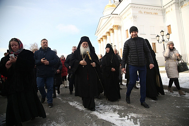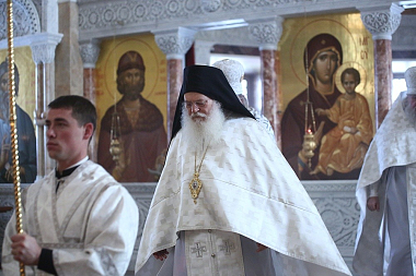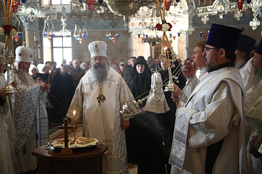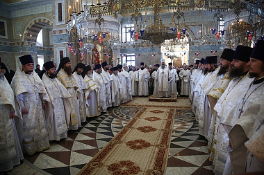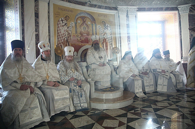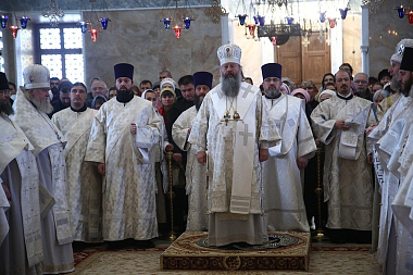 За литургией Его Высокопреосвященству сослужили многочисленные клирики Екатеринбургской епархии и архимандрит Ефрем с сопровождающей его братией монастыря Ватопед.