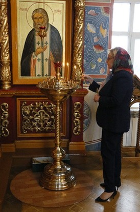 Затем гости прошли в Ближний скит обители. Митрополит Зиновий рассказал о нескольких храмах скита, после чего проводил Веронику Игоревну в келию старца схиархимандрита Феофана (Данькова) (+ 2013 год), в которой ныне организован его музей.