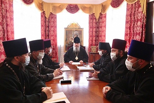 Участие в совещании приняли секретарь епархиального управления протоиерей Валерий Суворов, глава информационно-издательского отдела и отдела по монастырям и монашеству игумен Варлаам (Дульский), благочинный храмов города Северодвинск протоиерей Сергий Ермаков, настоятель Никольского собора протоиерей Александр Шестаков, настоятель северодвинского храма Владимирской иконы Божией Матери священник Димитрий Апполинариев и ключарь Ильинского кафедрального собора священник Андрей Чернушенко.