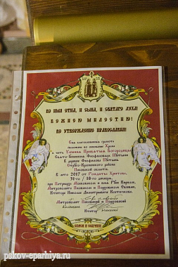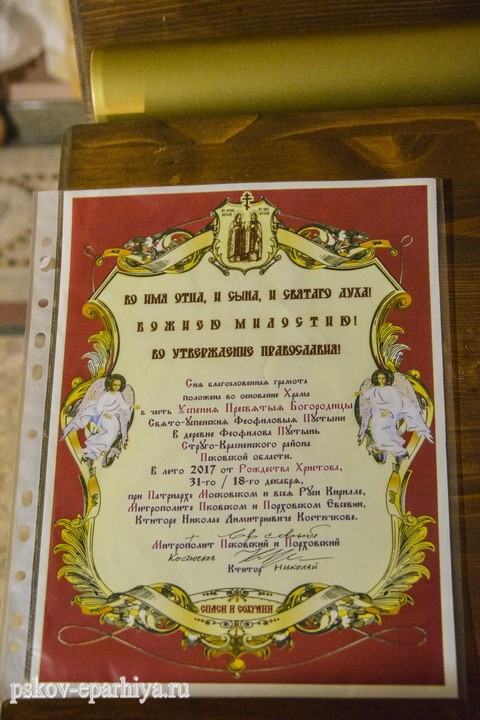 «Во имя Отца, и Сына, и Святого Духа! Божиею милостию во утверждение Православия! Сия благословенная грамота положена во основание храма в честь Успения Пресвятыя Богородицы Свято-Успенския Феофиловыя пустыни в деревне Феофилова пустынь Стругокрасненского района Псковской области в лето 2017 от Рождества Христова 31\18 декабря при Патриархе Московском и всея Руси Кирилле, митрополите Псковском и Порховском Евсевии, ктиторе Николе Дмитриевиче Костючкове».