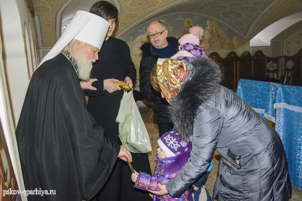В завершение псковский архипастырь вручил всем маленьким богомольцам сладкие подарки.