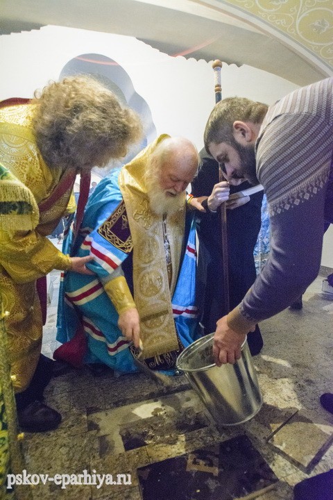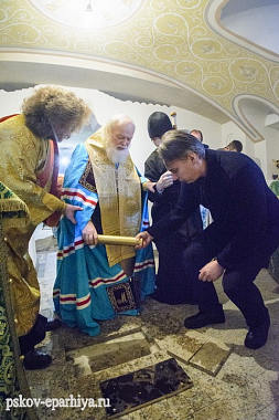 В сам день праздника в приделе Преподобных Феофила и Иакова Омучских Успенского храма Феофиловой пустыни перед началом Божественной литургии Высокопреосвященнейший владыка совершил чин положения закладной грамоты. В ходе молитвословия основание храма было окроплено святой водой, после чего Его Высокопреосвященство вместе с ктитором храма Николаем Костючковым вложил закладную грамоту:
