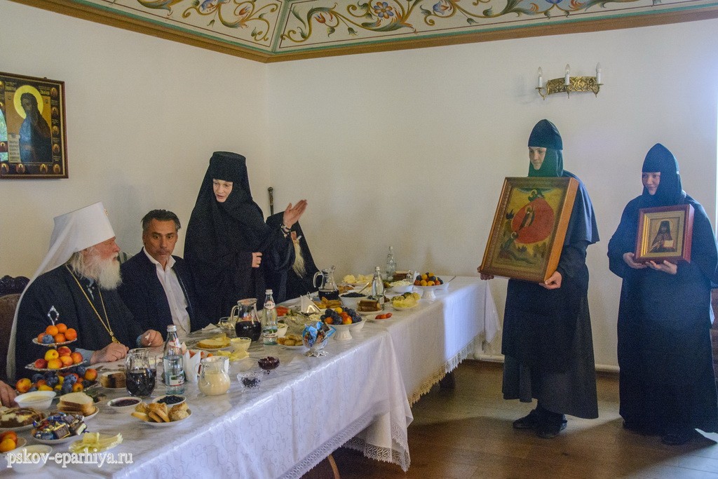 Все богомольцы и духовенство во главе с Псковским архипастырем были приглашены на праздничную трапезу, перед началом которой при пении тропаря Животворящему Кресту Господню и святому апостолу Иоанну Богослову новоосвященный крест был поднят на купол трапезного корпуса.