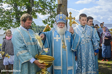 Его Высокопреосвященству сослужили епископ Гдовский Фома, викарий Псковской митрополии; протоиерей Александр Тимофеев, настоятель храма Успения Божией Матери пос. Струги Красные, а также местное духовенство.