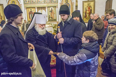 В завершение псковский архипастырь вручил всем маленьким богомольцам сладкие подарки.