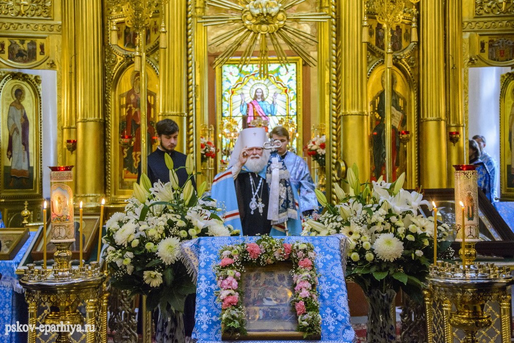 За богослужением молились настоятельницы Спасо-Казанского, Спасо-Елеазаровского и Снетогорского женских монастырей с сестрами и многочисленные паломники, собравшиеся в этот день в святую обитель почтить Пресвятую Богородицу.
