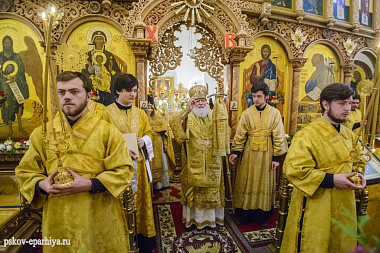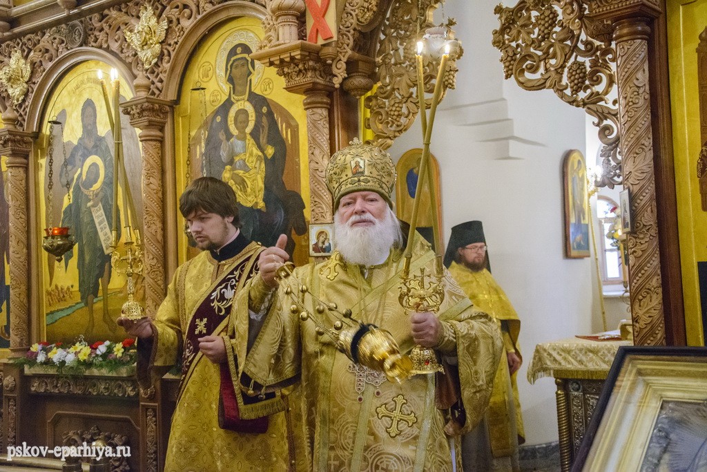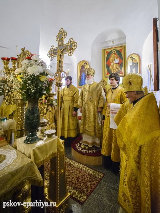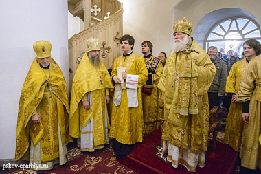 Его Высокопреосвященству сослужили наместник обители игумен Савва (Комаров) с братией в священном сане, наместник Свято-Благовещенской Никандровой пустыни архимандрит Спиридон (Иващенко), старейший клирик митрополии – почетный настоятель храма Святой великомученицы Варвары г. Печоры протоиерей Евгений Пелешев и духовенство митрополии.