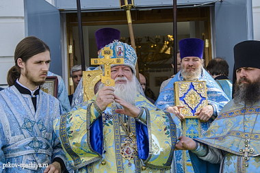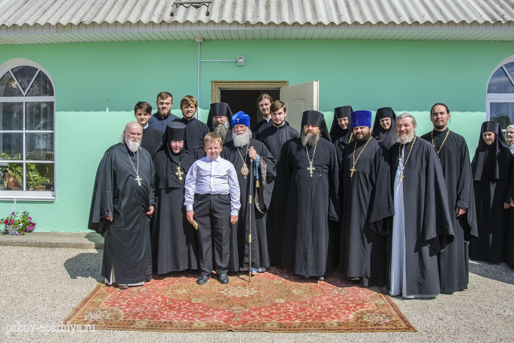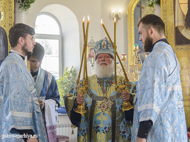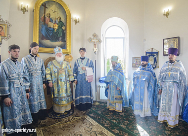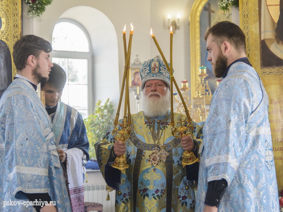 Его Высокопреосвященству сослужили наместник Свято-Благовещенской Никандровой пустыни архимандрит Спиридон (Иващенко), наместник Иоанно-Богословского Савво-Крыпецкого монастыря игумен Савва (Комаров), благочинный Островского округа священник Роман Павлов и духовенство митрополии.