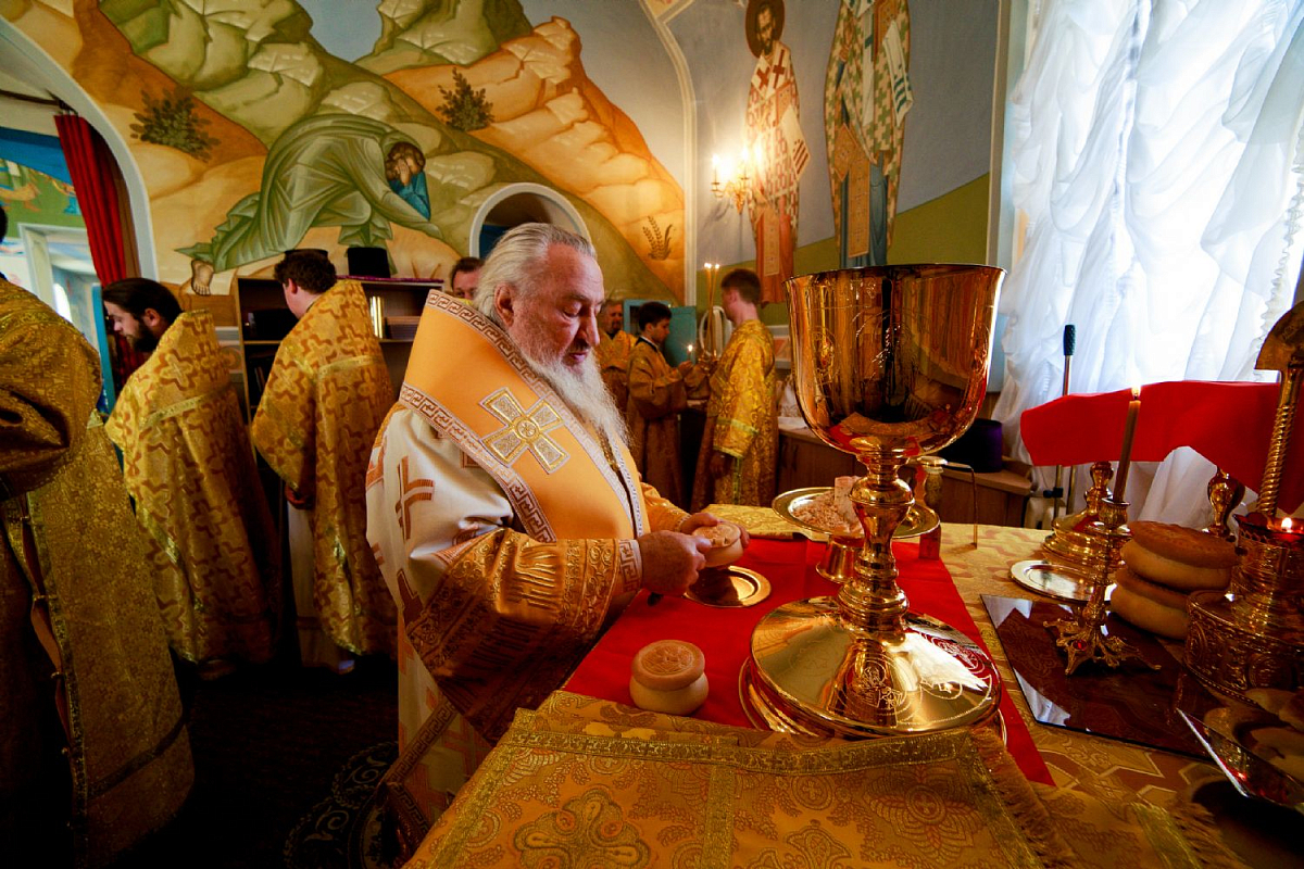 За Литургией Его Высокопреосвященству сослужили наместник Казанско-Богородицкого мужского монастыря г. Казани игумен Марк (Виленский), благочинный Елабужского округа Казанской епархии протоиерей Михаил Гречко, благочинный Закамского округа протоиерей Андрей Дубровин, благочинный Нижнекамского округа Чистопольской епархии протоиерей Александр Колчерин, настоятель Успенского храма города Казани протоиерей Алексий Краевский, настоятель Покровского собора г. Елабуги иерей Симеон Лепихин, настоятель храма Трех святителей с. Ижевка (Менделеевский район) иерей Владимир Тимофеев, священники Елабужского монастыря Илия Кривов, Даниил Кривов и Илия Павлов.