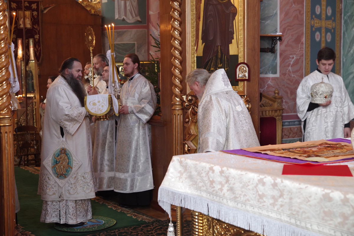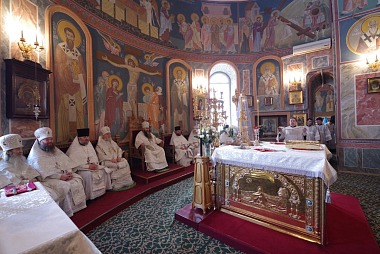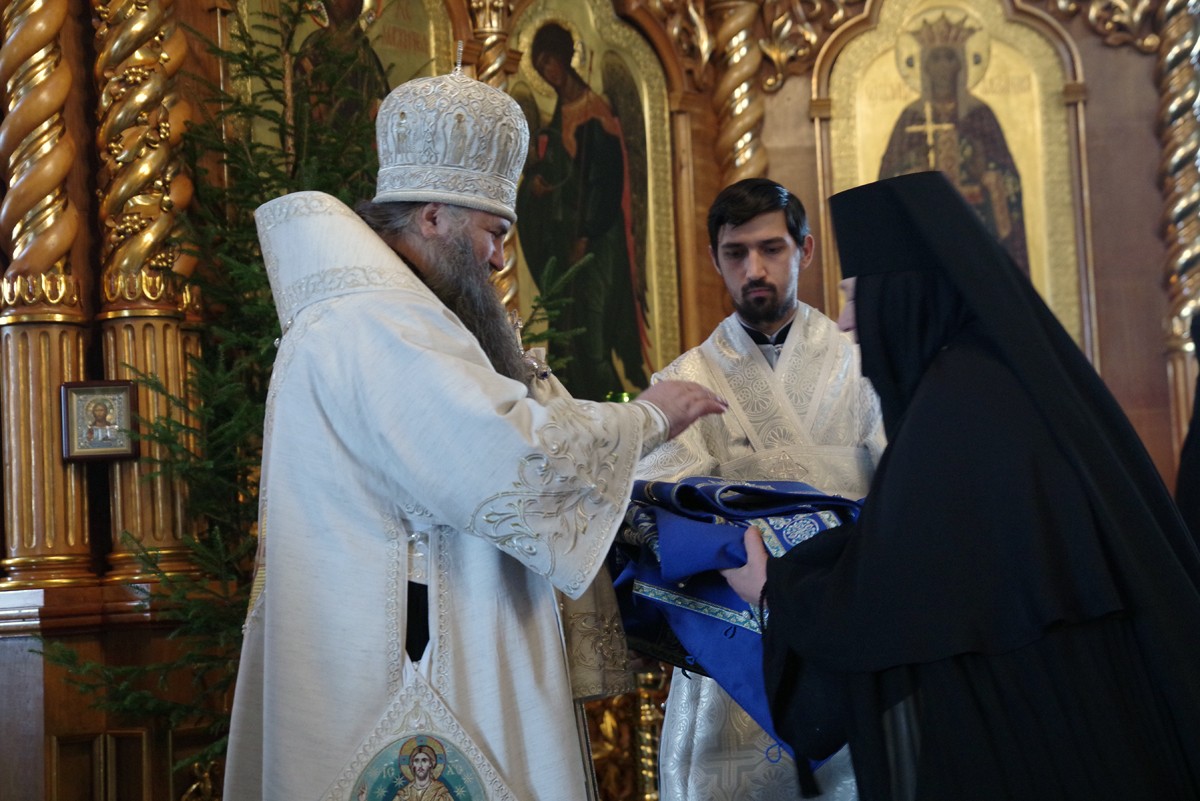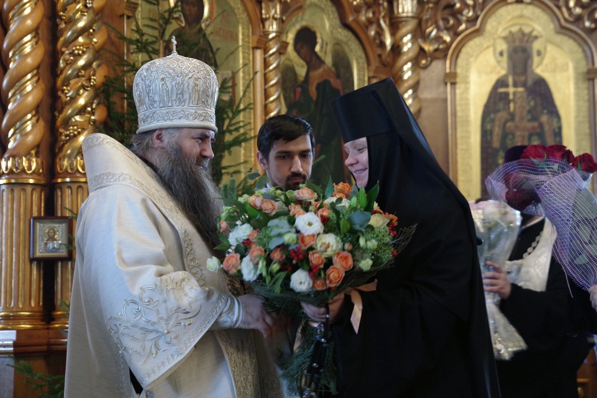 По окончании Литургии настоятельница Дивеевского монастыря игумения Сергия (Конкова) выразила архипастырям благодарность за визит и совершенное богослужение и преподнесла каждому из них заздравную просфору. Кроме того, от лица игумений женских обителей она подарила главе митрополии голубое архиерейское облачение.