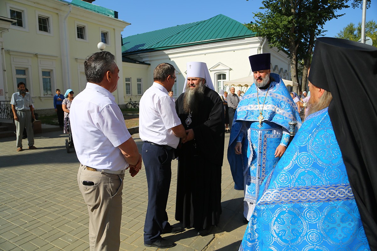 По окончании Литургии игумен Никон поблагодарил владыку Георгия за совершенное богослужение и труды по возрождению обители. Настоятель монастыря преподнес архипастырю заздравную просфору и икону Пресвятой Богородицы «Умиление» Серафимо-Дивеевскую. Игумен Никон выразил надежду, что следующий престольный праздник Саровской пустыни состоится в полностью восстановленном Успенском соборе.