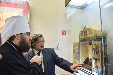Владыка Игнатий осмотрел экспозицию, в ходе осмотра комментарии и пояснения дала завотделом древнерусского искусства Государственной Третьяковской галереи Н.Н. Шерегеда.