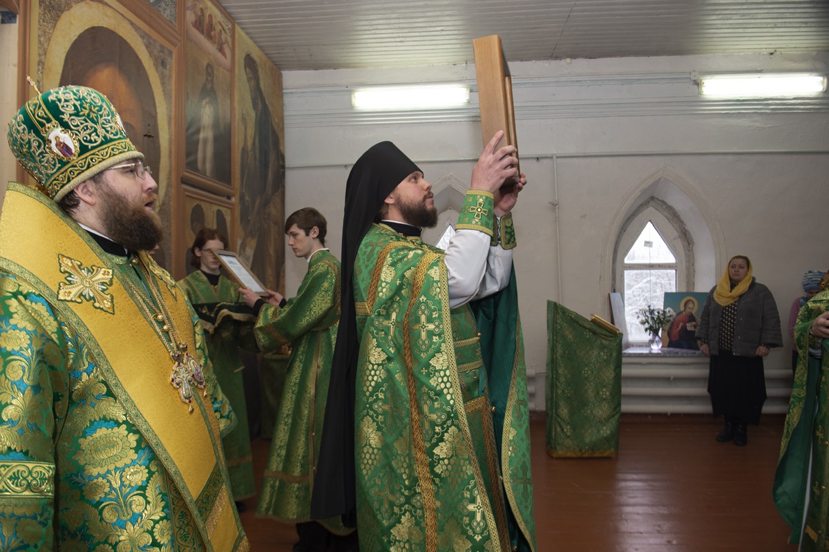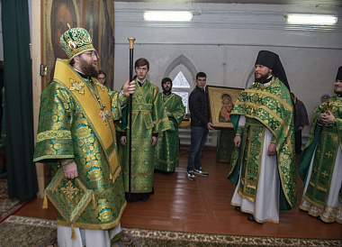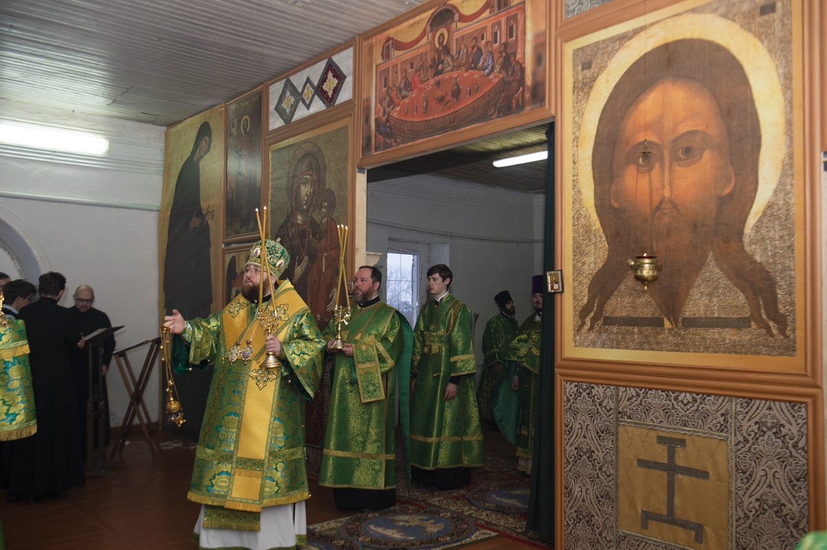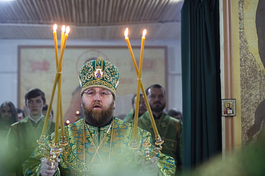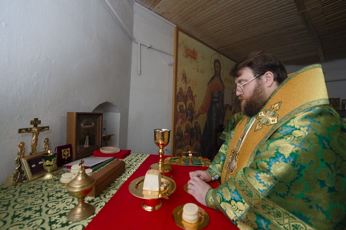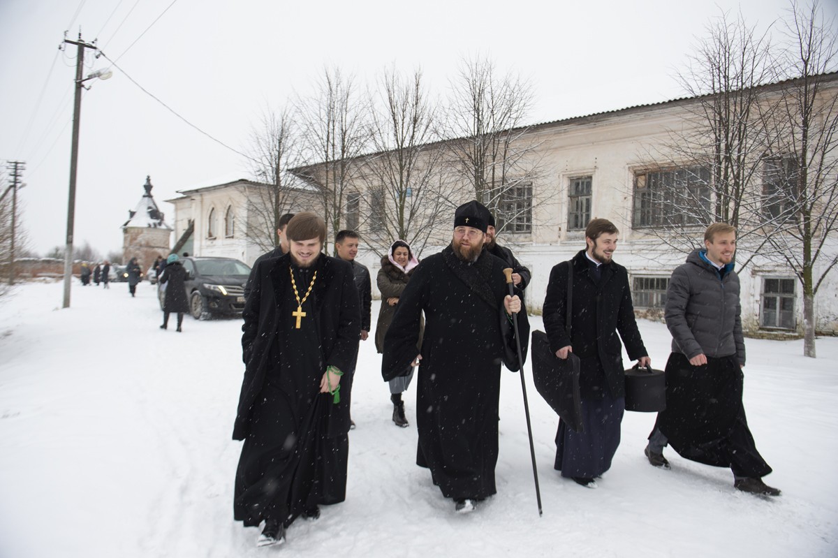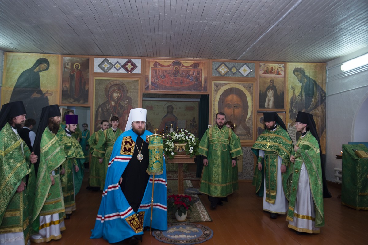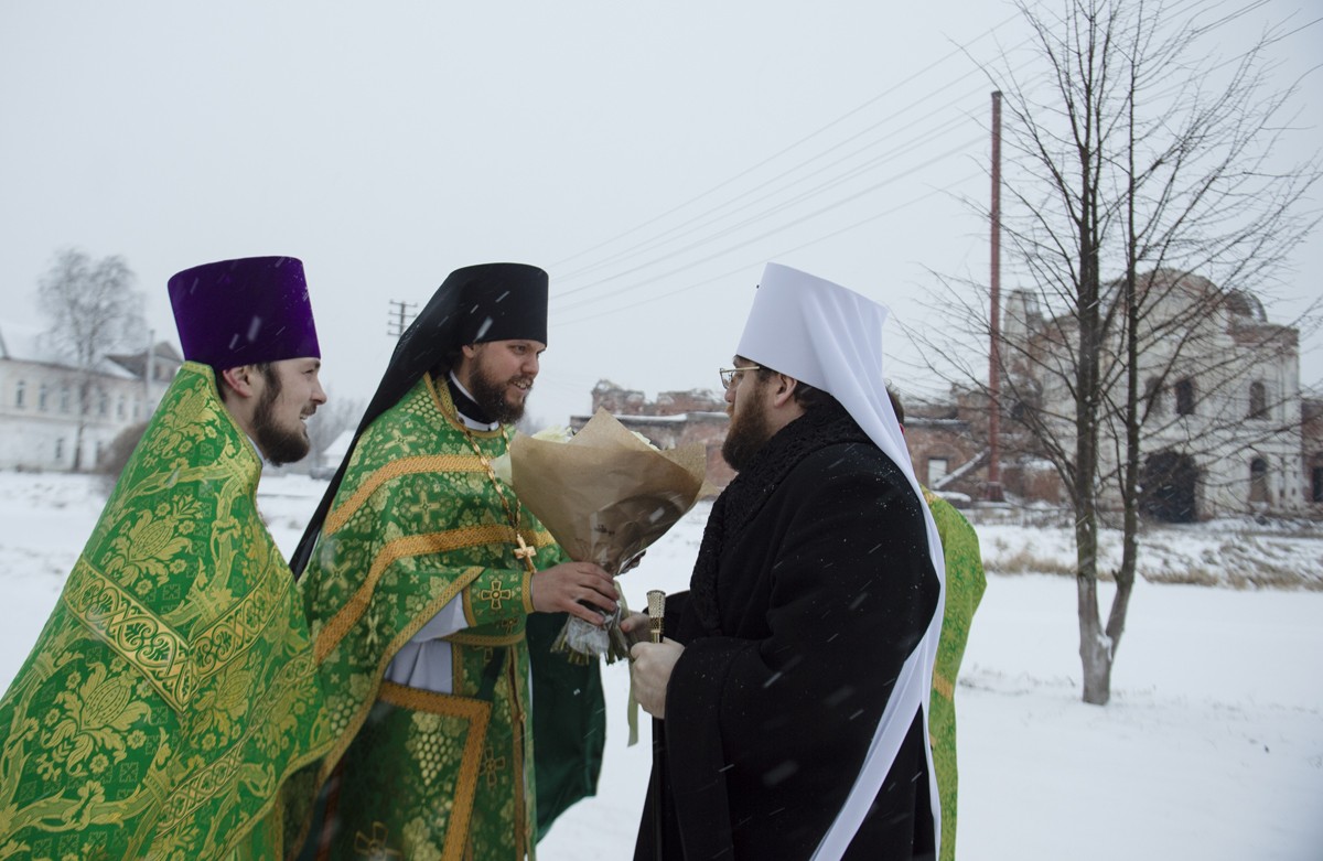 Его Высокопреосвященству сослужили настоятель Архиерейского подворья «Заоникиева Богородице-Владимирская мужская пустынь» иеромонах Никандр (Пилишин), руководитель Службы протокола иерей Алексей Булеков, секретарь главы Вологодской митрополии иеромонах Даниил (Дурягин), братия обители в священном сане.