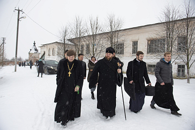 10 мая владыка Игнатий и глава Вологодского района С.Г. Жестянников осмотрели бывшие храмы монастыря и сохранившиеся здания, в которых до последнего времени располагалась специальная коррекционная школа-интернат.