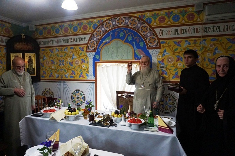 Далее все собравшиеся были приглашены на монастырскую трапезу, во время которой прозвучала сербская Богородичная песня «Живоносный Источник». Также сестры прочли поздравления в стихах для игумении и благодетелей и исполнили византийским распевом «Многая лета» митрополиту Исидору, игумении Неонилле и благодетелям обители.